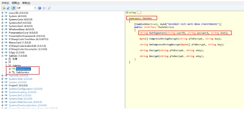第三方c#代码给的是一个service类implements另一个接口类,通过ILSPY(最新下载地址:https://github.com/icsharpcode/ILSpy)软件打开dll链接库,如下图,有两个类,类里有具体方法,本文采用下面第一个方法测试