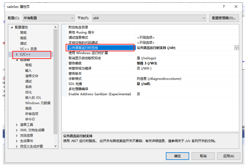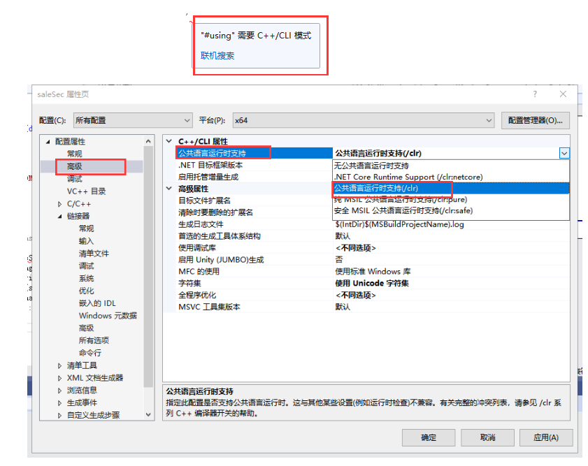 第一个错误,如下图,需要对公共语言进行时进行设置,右键项目→属性→高级→公共语言进行时,设置为公共语言运行时(/clr),应用