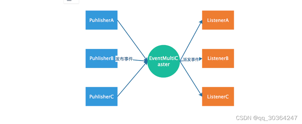 - 事件发布器(ApplicationEventMulticaster )对应于观察者模式中的被观察者/主题, 负责通知观察者 对外提供发布事件和增删事件监听器的接口,维护事件和事件监听器之间的映射关系,并在事件发生时负责通知相关监听器。
