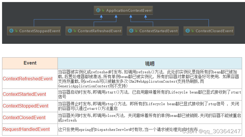 - 事件(ApplicationEvent) 负责对应相应监听器 事件源发生某事件是特定事件监听器被触发的原因。