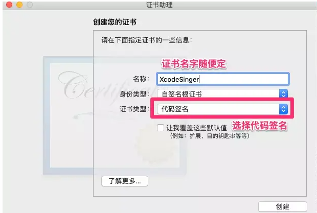电脑钥匙串中新建一个代码签名证书