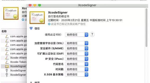在证书显示简介的信任里面选择全部信任
