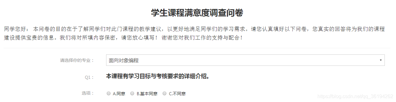 在课程管理下新增一个菜单“课程评价”,点击课程评价后是一个课程问卷,课程问卷答案用A,B,C等等来标识,最后有一个提交按钮,用户点击提交,把问卷答案存到数据库