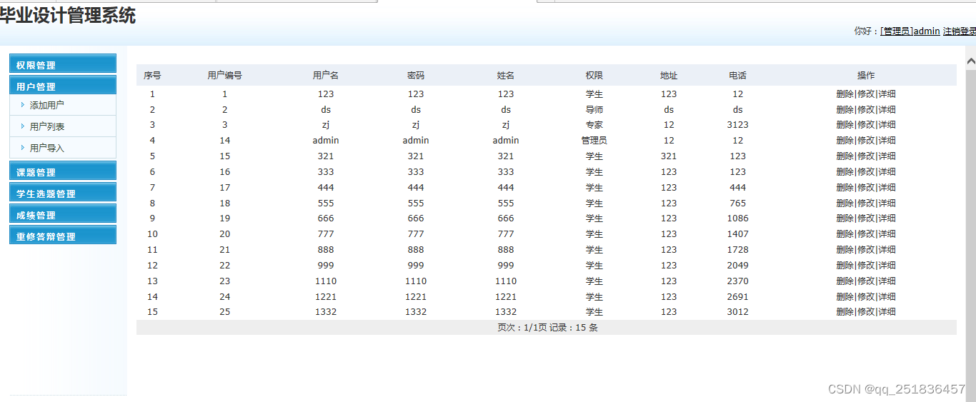 毕业设计管理系统主要由前端用户功能模块的设计与实现和后台管理功能模块的设计与实现。前端的主要功能有用户登录、密码修改、选题、开题、提交论文、论文审核等;后台管理员的主要功能有用户信息导入、权限设置、系统维护等。