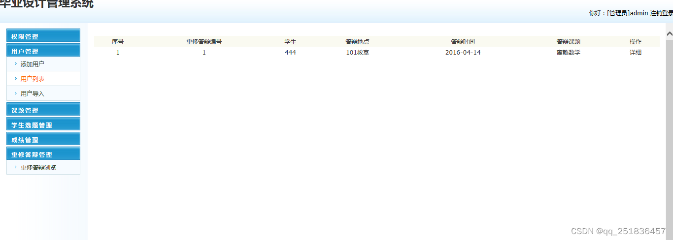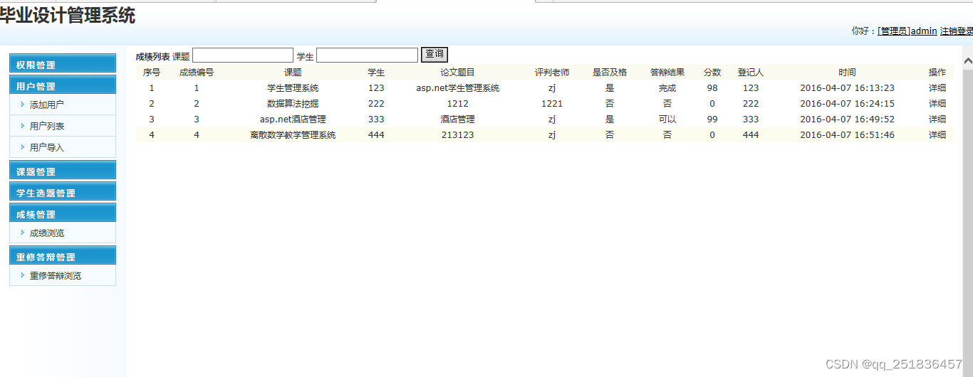 成绩发布:管理人员统计信息及论文成绩发布,成绩不合格重新安排答辩,成绩合格则发布成绩