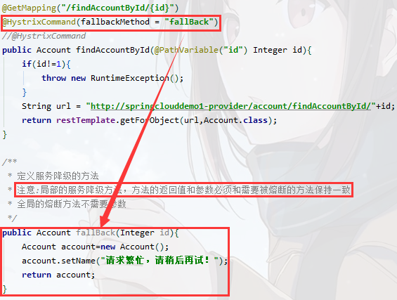 注意:局部的服务降级方法,方法的返回值和参数必须和需要被熔断的方法保持一致
