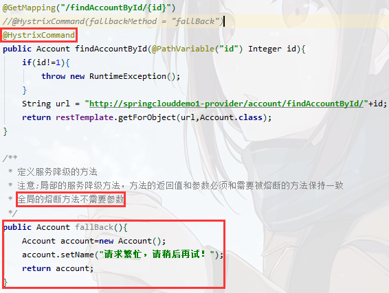 @DefaultProperties(defaultFallback = “defaultFallBack”):在类上指明统一的失败降级方法