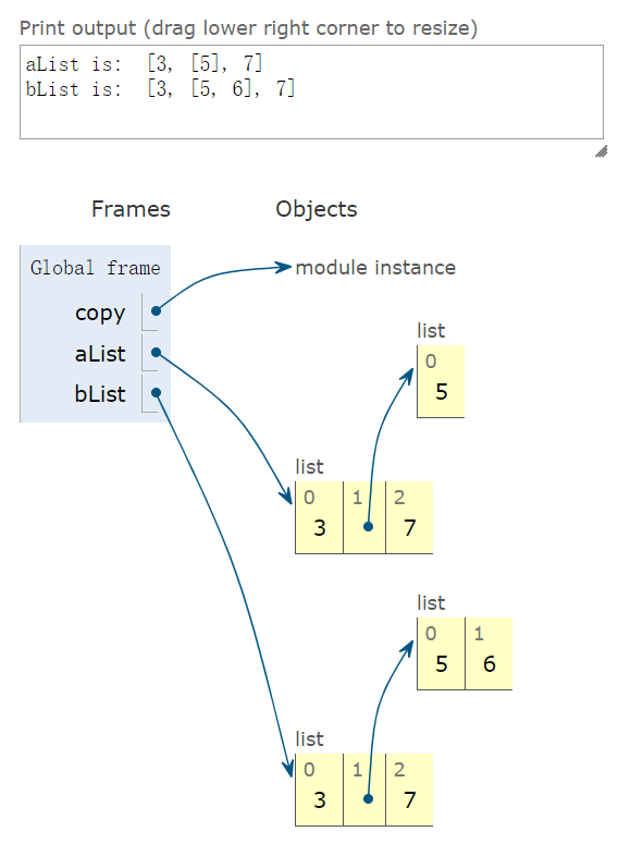>>> bList[1].append(6) #修改bList不会影响aList