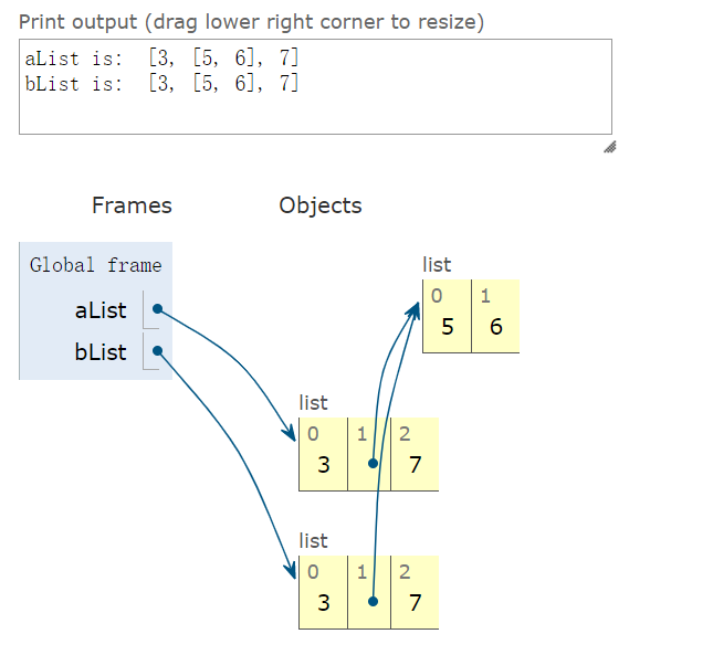 >>> aList = [3, [5], 7] #列表aList中包含可变的列表对象 >>> bList = aList[:] #切片 >>> bList[1].append(6) #调用子列表的append()方法,这个方法是原地操作的 >>> bList [3, [5, 6], 7] >>> aList #aList受到影响 [3, [5, 6], 7]