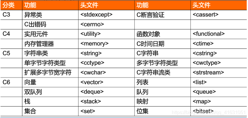 2.C++标准库所有的头文件都没有扩展名(.h),内容总共在51个标准头文件中定义。其中18个<cname> 形式的头文件(<complex>除外)内容与标准C语言的name.h头文件相同,但包含了C++扩展的功能。