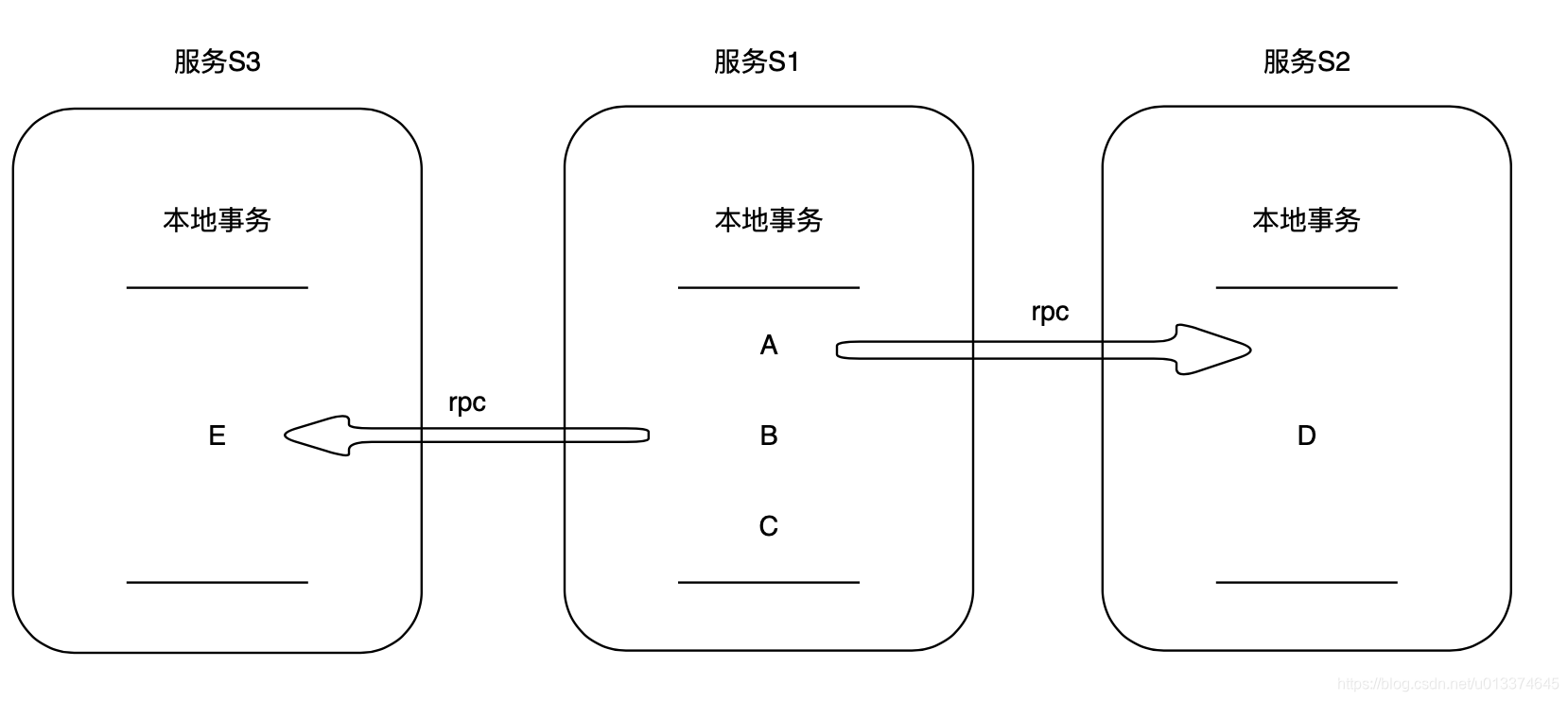 - A,B成功了,C失败了,S1的本地事务回滚,S2和S3都不感知