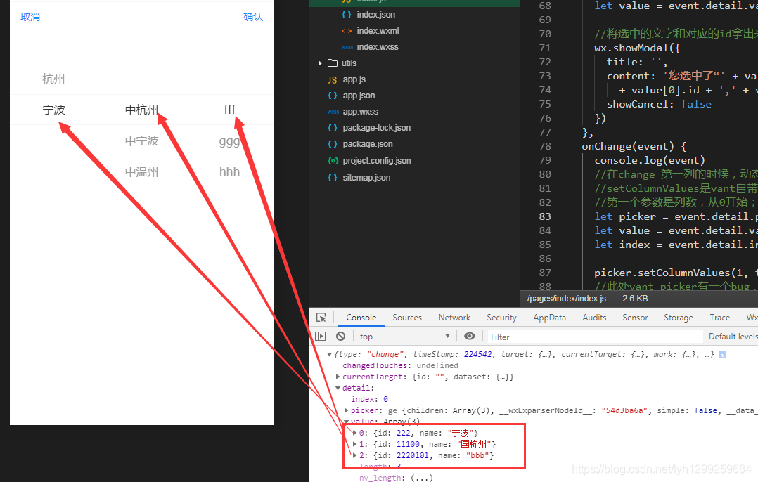 首先,我们可以清晰的看到,我们是可以获取到用户操作的那一列的下标的,0:第一列,1:第二列,2:第三列,依次类推,那么我们就可以通过下标判断,如果是第一列也就是index是0的情况,说明只滑动了第一列,我们就使用第二列的第一个对象数组key,否则就按照change方法返回的对象数组key,代码展示如下: