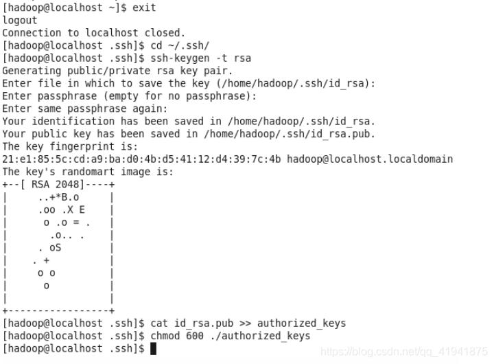 但这样登陆是需要每次输入密码的,我们需要配置成SSH无密码登陆比较方便。首先输入 exit 退出刚才的 ssh,就回到了我们原先的终端窗口。然后利用 ssh-keygen 生成密钥,并将密钥加入到授权中:
