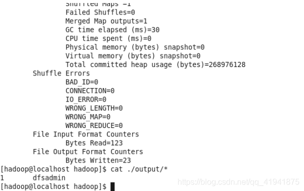 hadoop jar /usr/local/hadoop/share/hadoop/mapreduce/hadoop-mapreduce-examples-*.jar grep input output 'dfs[a-z.]+'运行时的输出信息与伪分布式类似,会显示 Job 的进度。