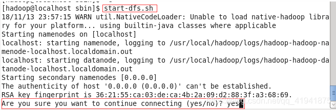 此时会有如下提示(SSH首次登陆提示),输入 yes 。然后按提示输入密码 hadoop,这样就登陆到本机了。