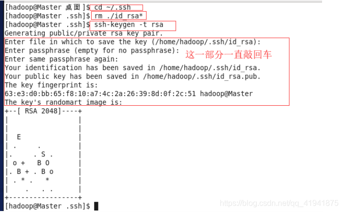 这个操作是要让 Master 节点可以无密码 SSH 登陆到各个 Slave 节点上。首先生成 Master 节点的公匙,在 Master 节点的终端中执行(因为改过主机名,所以还需要删掉原有的再重新生成一次):