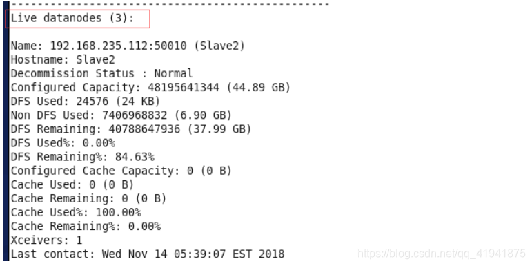 hdfs dfsadmin -report 查看 DataNode 是否正常启动,如果 Live datanodes 不为 0 ,则说明集群启动成功。例如我这边一共有3个 Datanodes: