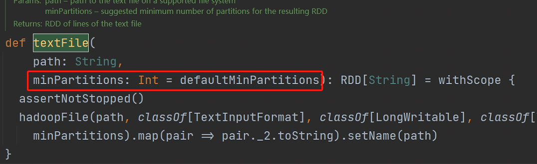 对于textFile方法的minPartitions参数,如果在调用的时候不进行赋值,则会默认是使用defaultMinPartitions对应值。