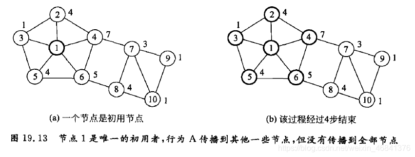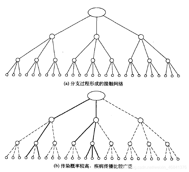 疾病通过一种接触网络传播,每个节点代表一个人,两个点之间的边表示他们有所接触,从而疾病就可能从一个节点传到另一个