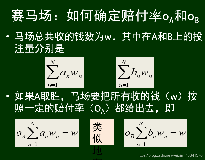 由两匹马A和B比赛,A和B的赔付率为oA和oB,钱数w下注,下注A的比例为a,下注B的比例为1-a