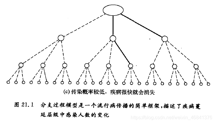 基本再生数记为R0,是一个单一个体引发新病例数的期望值。在模型中,每个人会遇到k个人,每个人受感染的概率为p,因此基本再生数R0 = pk。疾病在分支过程中的传播结果取决于基本再生数是小于1还是大于1