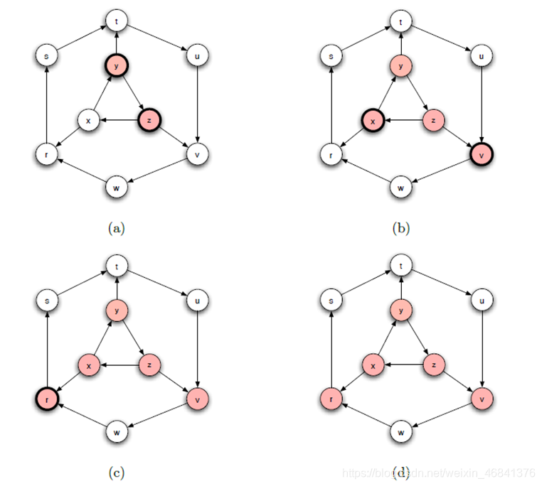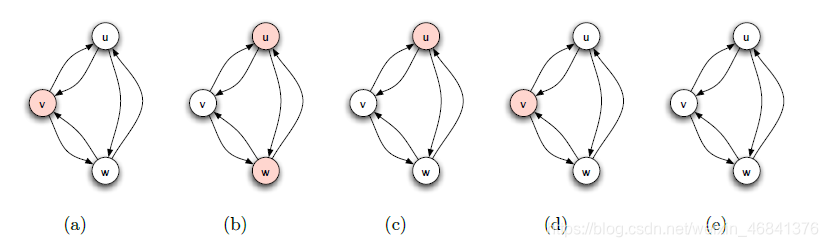 如果节点u在时刻1患有疾病,就可能传染给通向节点y的所有节点,包括中间节点v和w