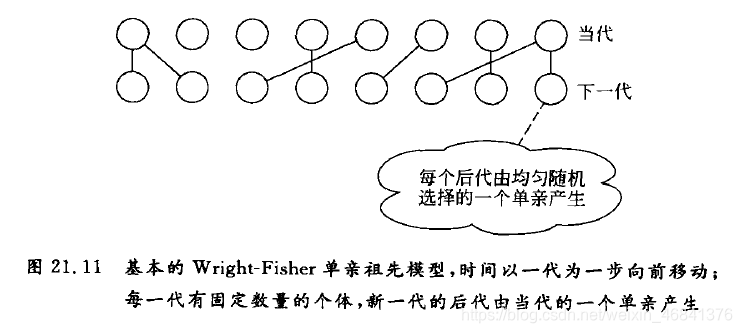 考虑一个群体受资源的约束,每一代的人口数量维持为固定的N。新的一代是由当前一代N个个体产生总共N个后代。新一代的每个后代由一个单亲产生,这个单亲实在当代中随机独立地选择