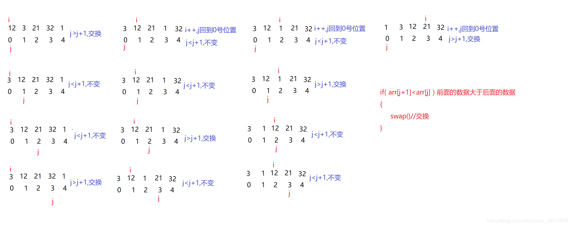 - 当j从头到尾完成遍历,i++,j回到0号下标,i控制每一趟已经处理的已排序的个数