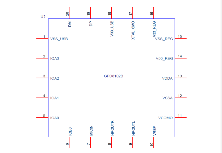GPD8102B 是一颗专为 USB headset 装置所设计的 USB stereo audio 单芯片。其为免晶振模式设计,但是也可以选择接成晶振模式。而封装型式为 QFN20,可简化 PCB 设计及缩小 PCB 尺寸。具有双声道高解析 DAC 及单声道 ADC 并内建麦克风前置放大器(MIC booster)。并可透过外接24C02 EEPROM 提供客制化的 USB 装置 VID/PID、字符串及初始设定值。