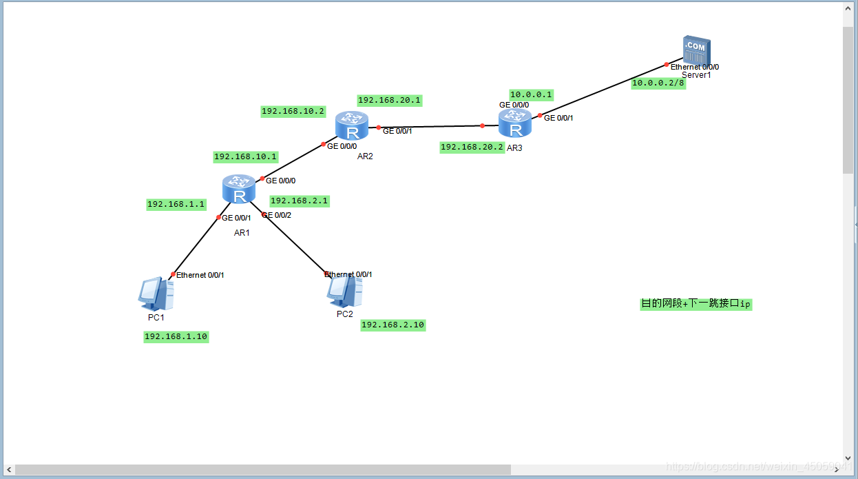 【R1】ip route-static 192.168.20.0 24 10.0.0.2