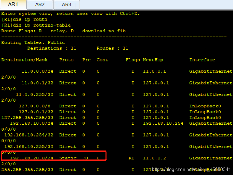 【R1】ip route-static 192.168.20.0 24 11.0.0.2 preference 70