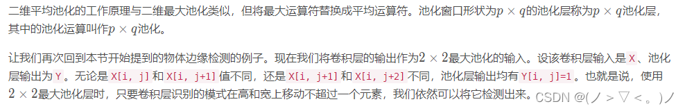 ·实际图像里,我们感兴趣的物体不会总出现在固定位置:即使我们连续拍摄同一个物体也极有可能出现像素位置上的偏移。这会导致同一个边缘对应的输出可能出现在卷积输出 Y中的不同位置,进而对后面的模式识别造成不便。