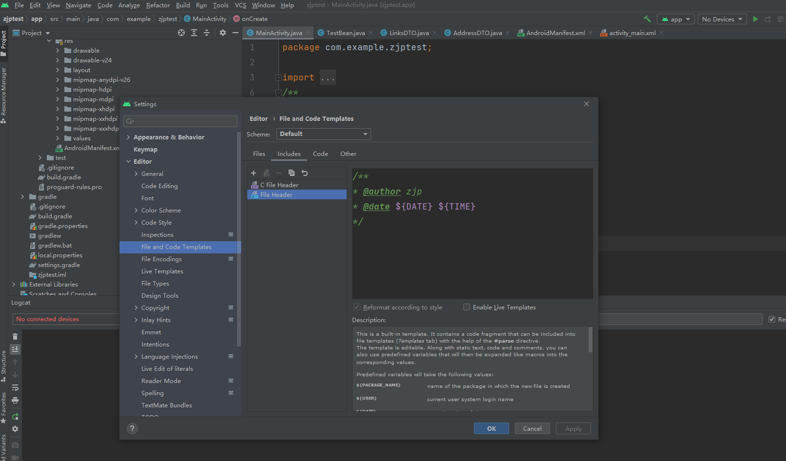 打开setting–》editor–》File and CodeTemplates,找到其中的Includes选项卡,设置File Header为如下代码: