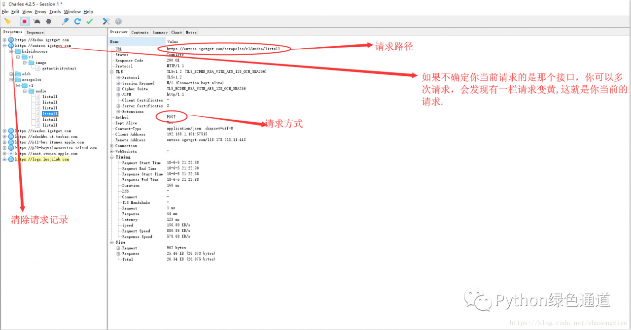 打开Charles 然后打开手机,得到App,进入逻辑思维栏目. 多次刷新App, 在Charles中 Structure中有变黄的一项就是我们当前的请求,