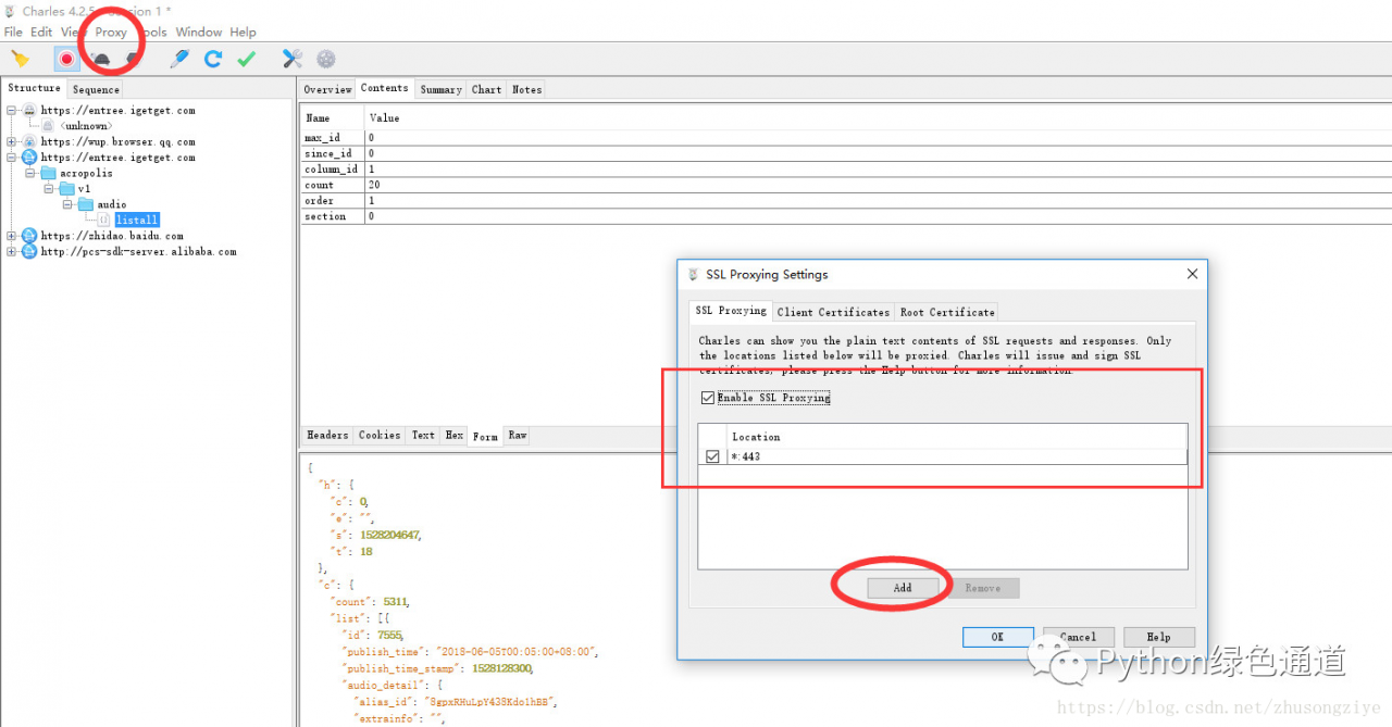 如果获取到的数据是乱码,你要设置一下连接SSL证书 在Charles中 菜单栏==>proxy==>SSL Proxying Settings ==>添加443,如上图所示. 然后当你在真正抓取数据的时候,记得把这个关掉,以免取不到数据