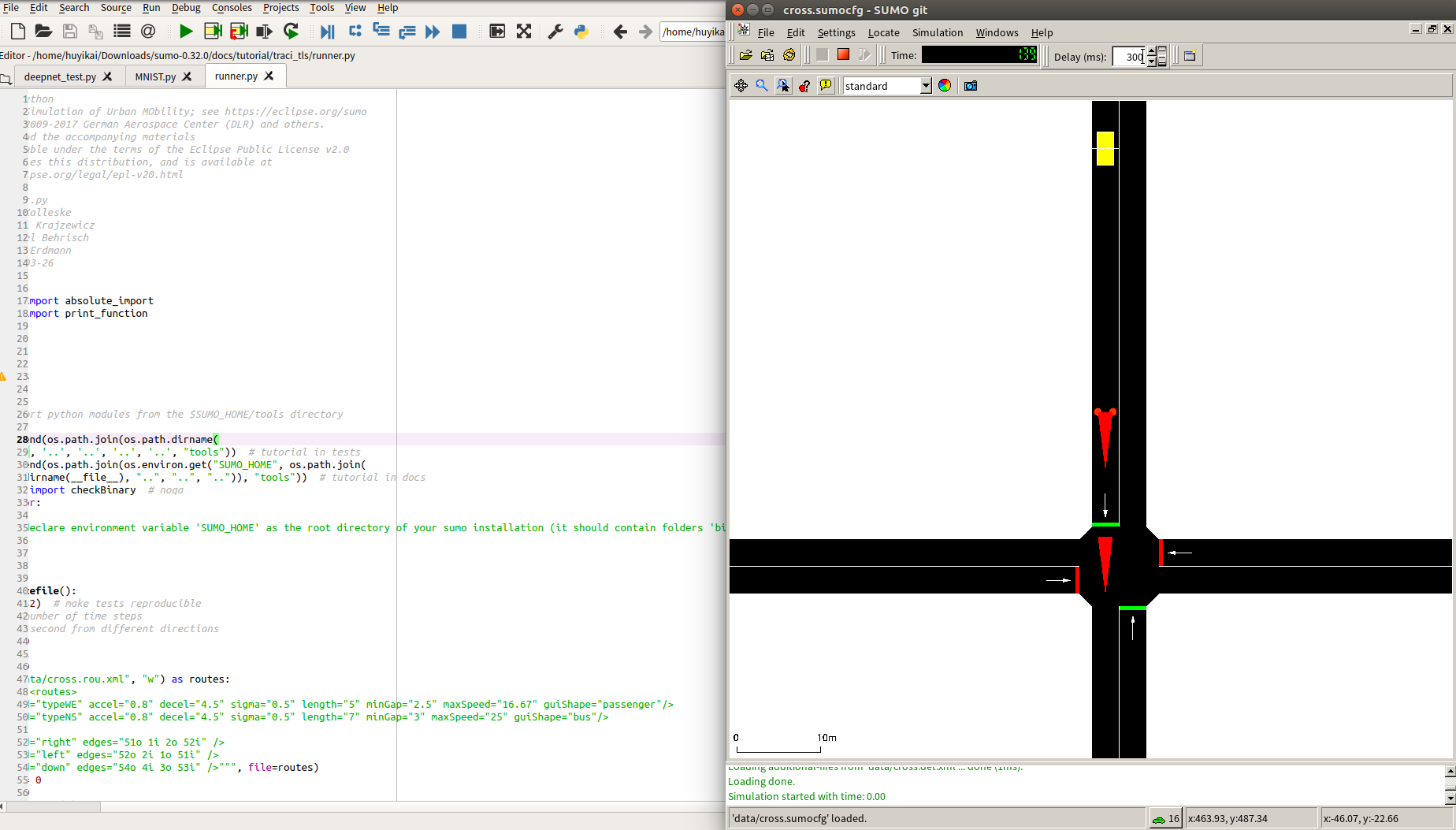 例程在/sumo-0.32.0/docs/tutorial/traci_tls 中,其中runner.py为核心脚本。