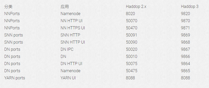 Hadoop 3.x后,应用的端口有所调整,如下: