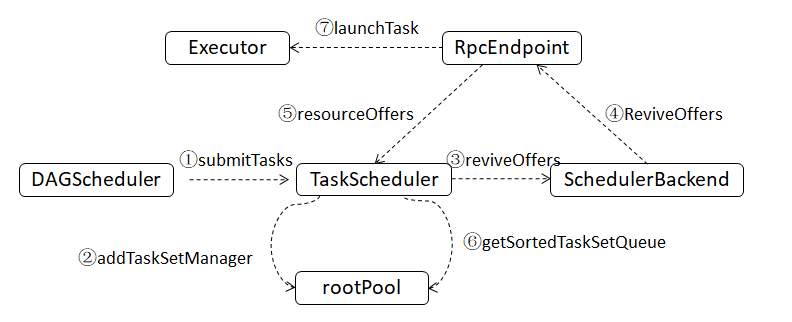 - 记号②:代表TaskScheduler接收到TaskSet后,创建对此TaskSet进行管理的TaskSetManager,并将此TaskSetManager通过调度池构建器添加到根调度池中