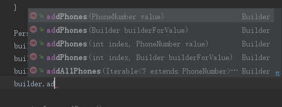 PersonProto.Person person = builder.build();对于集合属性,可以通过add()方法设置
