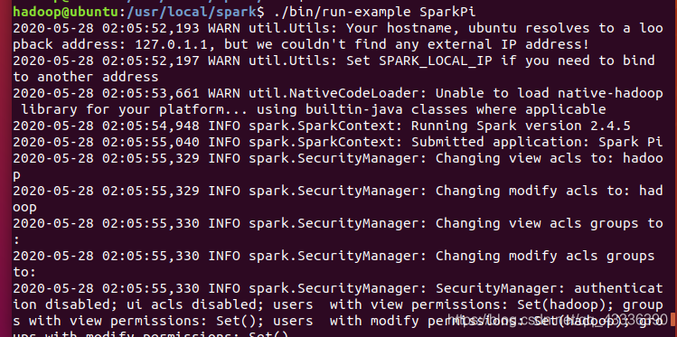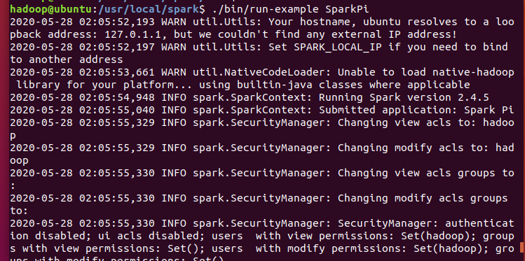 配置完成后,就可以直接使用Spark,不需要像Hadoop那样运行启动命令,通过运行Spark自带的实例,可以验证Spark是否安装成功,命令如下: