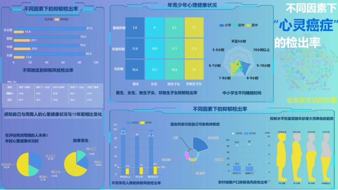 当前抑郁症已成为了人类第二大疾患,从可视化数据图里我们也能清晰的观看到不同因素的检出率。而抑郁症的就诊率却不到20%,绝大多数人是不知道如何寻求帮助,也不知道怎么去提供帮助。我们可以多了解相关的知识,尊重、理解并鼓励他们放下顾虑,积极就诊。
