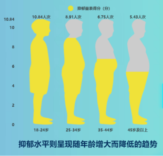 将调查对象划分为四个年龄段:18~24岁、25~34岁、35~44岁、45岁及以上。分析发现,年龄差异显著。随着年龄增大,抑郁水平则呈现随年龄增大而降低的趋势。