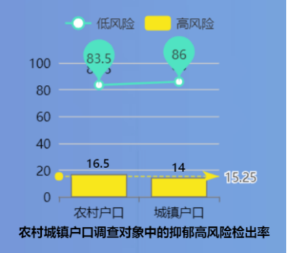对户口类型不同的调查对象进行分析,发现抑郁水平在统计上存在显著差异。农村户口人群中抑郁高风险的检出率为16.5%,略高于城镇户口的检出率14.0%。