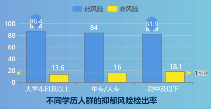 以抑郁为例,大学本科及以上群体的抑郁高风险检出率为13.6%,中专/大专群体的检出率为16%,高中及以下群体的检出率为18.1%。
