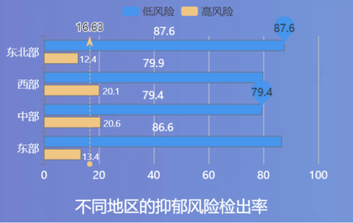 东部地区人们的心理健康状况显著优于其他地区。以抑郁调查结果为例,东部地区的抑郁高风险检出率为13.4%,东北地区的检出率为12.4%,中部地区的检出率为20.6%,西部地区的检出率为20.1%。