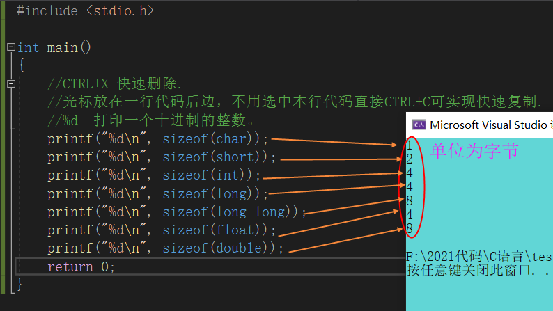 }通过上面的代码我想大家对这些数据类型有了初步的了解,那么为何整型要分为short、int、long、long long、而浮点数据类型要分为float 、double呢?其原因就在于它们所占空间大小的不同,任何变量的创建都要在内存中开辟空间,而计算变量所占空间大小我们就不得不提到关键字:sizeof ,c语言中的sizeof是用来计算变量或者使用类型创建的变量的大小,单位是字节。下面我们来看一下不同数据类型所占内存空间的大小。