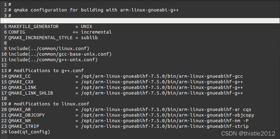 修改文件./qt-everywhere-src-5.12.1/qtbase/mkspecs/linux-arm-gnueabi-g++/qmake.conf