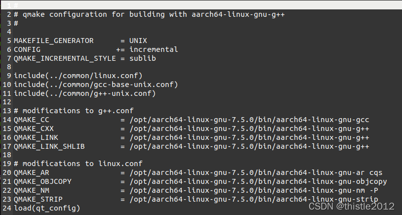 修改文件./qt-everywhere-src-5.12.1/qtbase/mkspecs/linux-aarch64-gnu-g++/qmake.conf