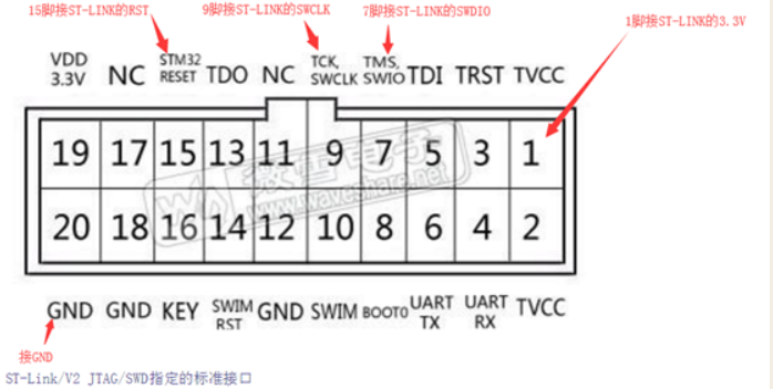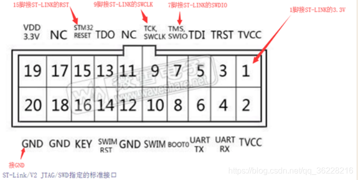 st-linkv2模块上的各个引脚功能在其金属包装上可以找到