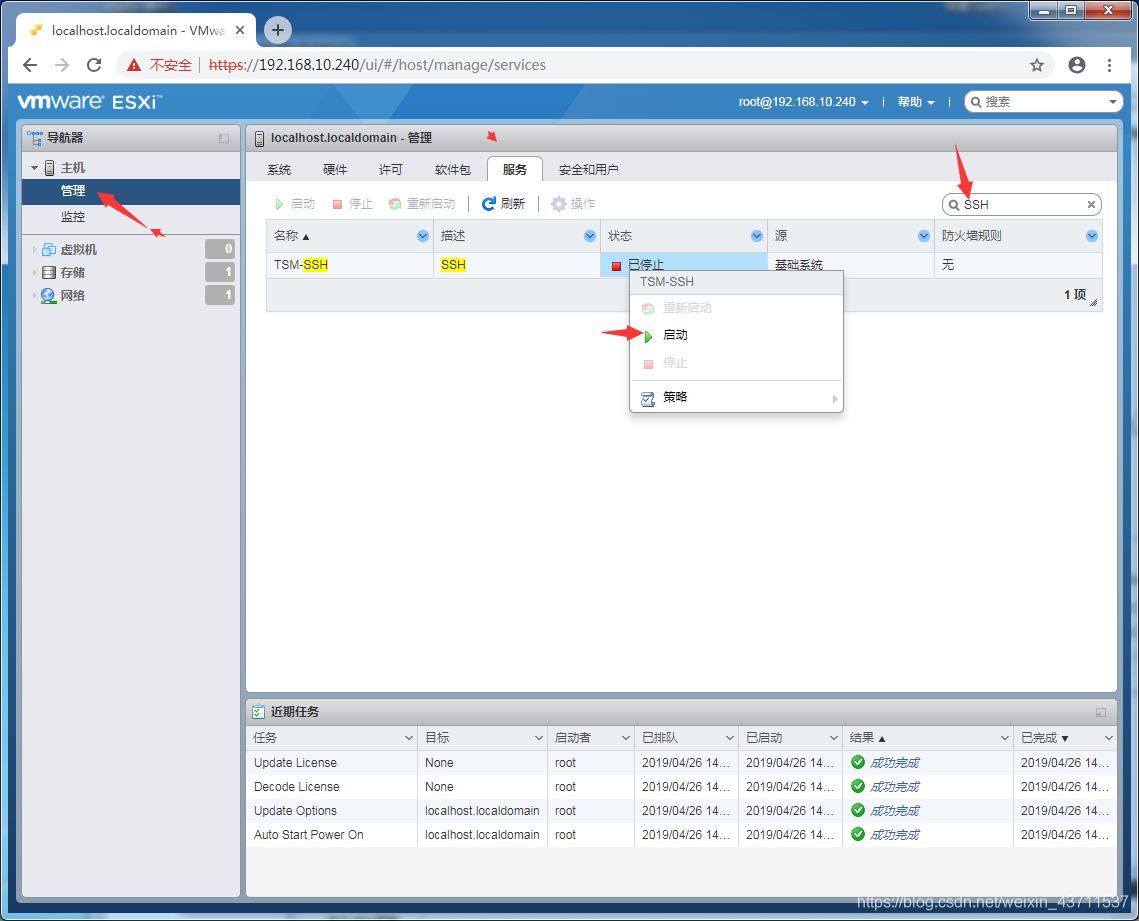 连接时,先打开esxi的SSH